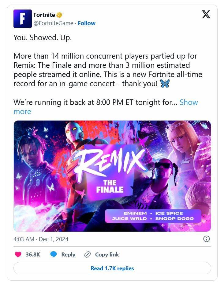 据 Epic Games 官方推特发布的数据,本次活动期间,《堡垒之夜》的游戏内同时在线万,再次刷新了游戏内音乐会的在线玩家纪录。此外,活动还吸引了超过300万观众通过网络直播同步观看,为这场虚拟盛会增添了更多亮点。