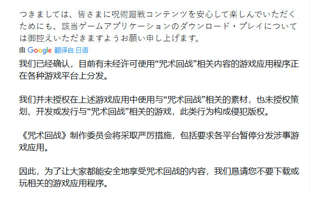 官方指出,这些游戏在策划、开发及发行过程中,从未获得任何使用《咒术回战》角色、素材或内容的许可,其行为已明确构成版权侵权。制作委员会表示,已决定依法追究责任,并将正式向各大应用商店提出申请,要求对涉事游戏进行下架处理。