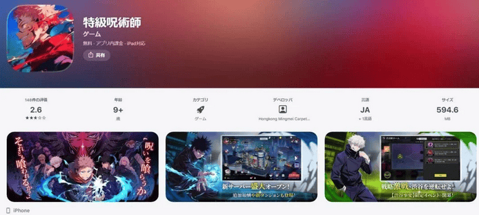 进一步调查显示,在苹果 App Store 页面中,该游戏的发行商登记为香港公司“Hongkong Mingmei Carpet Manufacture International Group Limited”,版权标注为“©特级咒术师”。虽然游戏介绍刻意回避直接提及《咒术回战》,但应用图标中的角色形象被指与原作关键角色“宿傩”极为相似。商店截图中也能看到多名外观、名称与原作角色高度雷同的人物,甚至有玩家发现游戏内直接使用了诸如“领域展开·无量空处”等原作中的标志性术语。