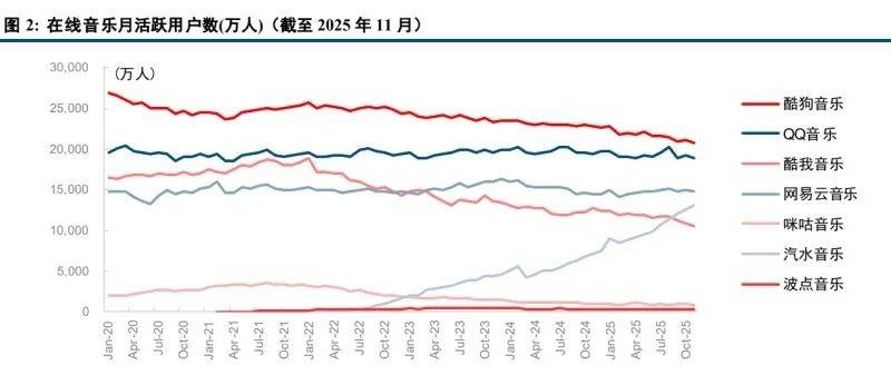 各音乐平台之间的用户重叠情况。QQ 音乐与网易云音乐的重合用户规模最大,但两者的月活跃用户数均 保持相对稳定,呈现“动态平衡”的竞争态势。与汽水音乐重合度最高的平台分别为 QQ 音乐和酷狗音乐,汽 水音乐与其他平台的徘徊用户数量预计仍将增长。QuestMobile 数据显示,2025 年 9 月,汽水音乐与酷狗音乐、 QQ 音乐的重合用户数均约为 2150 万,各占汽水音乐当月 MAU 的 17.9%。 在重叠用户中,汽水音乐增长显著,QQ 音乐仅出现小幅月活下滑,酷狗音乐则同比下降 8.1%,跌幅较为 明显。这一差异表明,汽水音乐的快速崛起,对同属腾讯音乐旗下、用户结构更为下沉的酷狗音乐,形成了更 为直接的冲击。 总体来看,汽水音乐的增长并非直接争夺传统平台的存量核心用户,而是在更广阔的价格敏感与场景混合 型用户中开辟增量,从而推动音乐消费市场进一步分层。